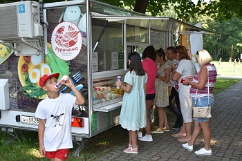 В ходе соревнований юные и взрослые спортсмены подкрепляли силы полезными продуктами из передвижного магазина агрохолдинга "ДолговГрупп". Здесь же они фотографировались на фоне веселых персонажей.